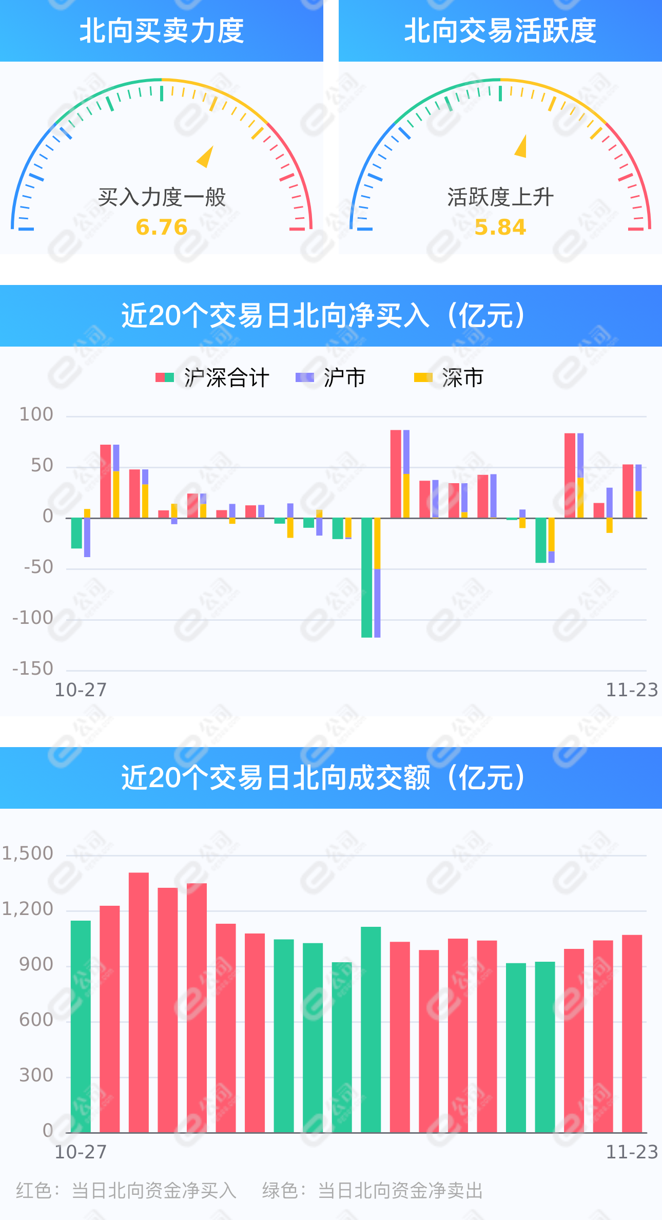 证券时报网讯,11月23日,截至A股收盘,统计数据显示北向资金合计净买入52.23亿元,其中沪股通净买入25.97亿元,深股通净买入26.26亿元。北向资金成交金额1067.70亿元,占A股总成交额8.75%,交易活跃度上升2.94%,其中沪股通买入金额246.57亿元,卖出金额220.60亿元,深股通买入金额313.39亿元,卖出金额287.13亿元。