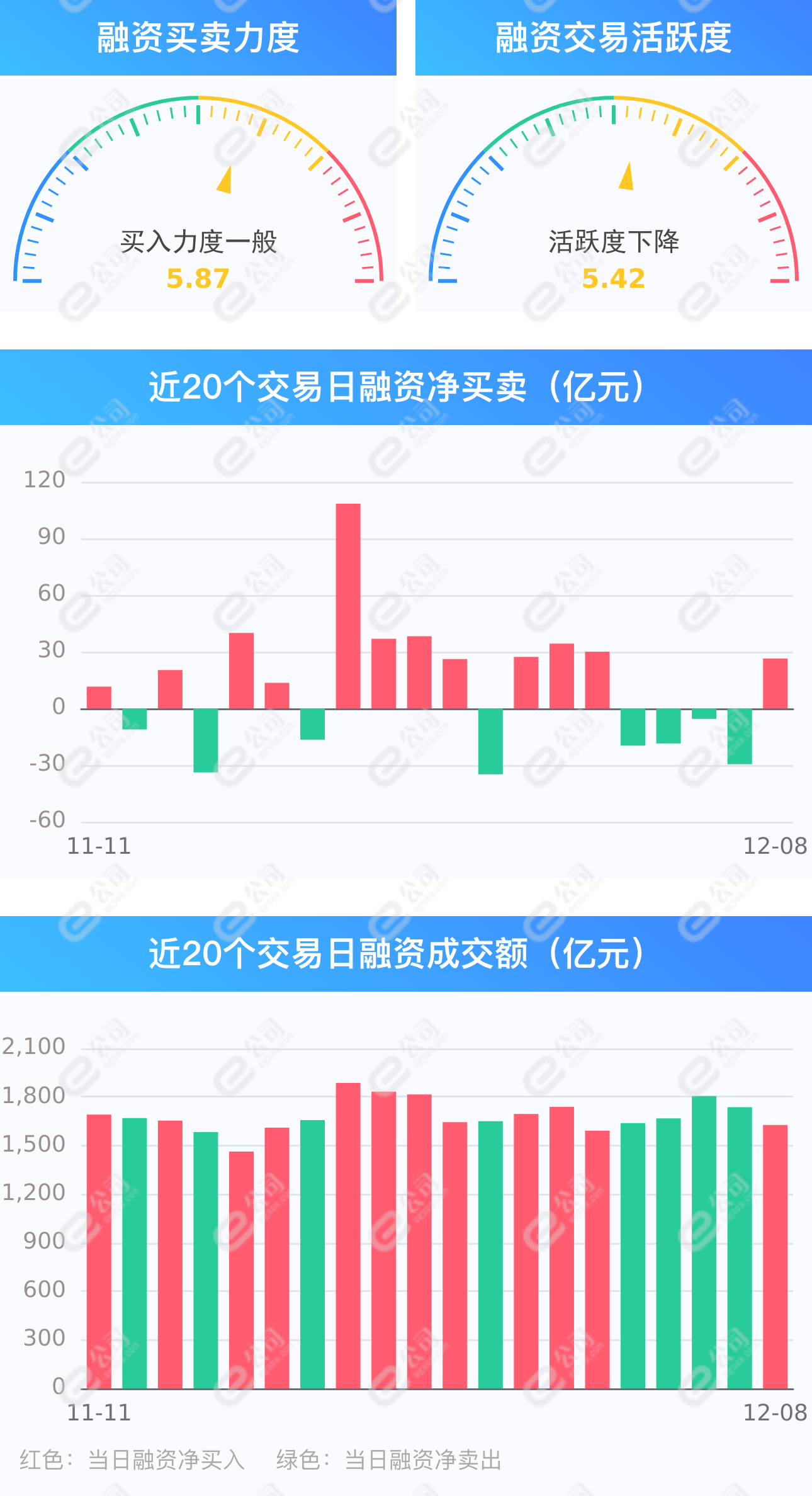 证券时报e公司讯,截至12月8日,上交所融资余额报9078.81亿元,较前一交易日增加17.64亿元;深交所融资余额报8143.53亿元,较前一交易日增加8.67亿元;两市合计17222.34亿元,较前一交易日增加26.31亿元,融资交易额1626.93亿元,占A股成交额14.88%,其中融资买入额826.62亿元,融资偿还额800.31亿元,交易活跃度下降6.32%。统计发现,融资客中止连续4日净卖出。