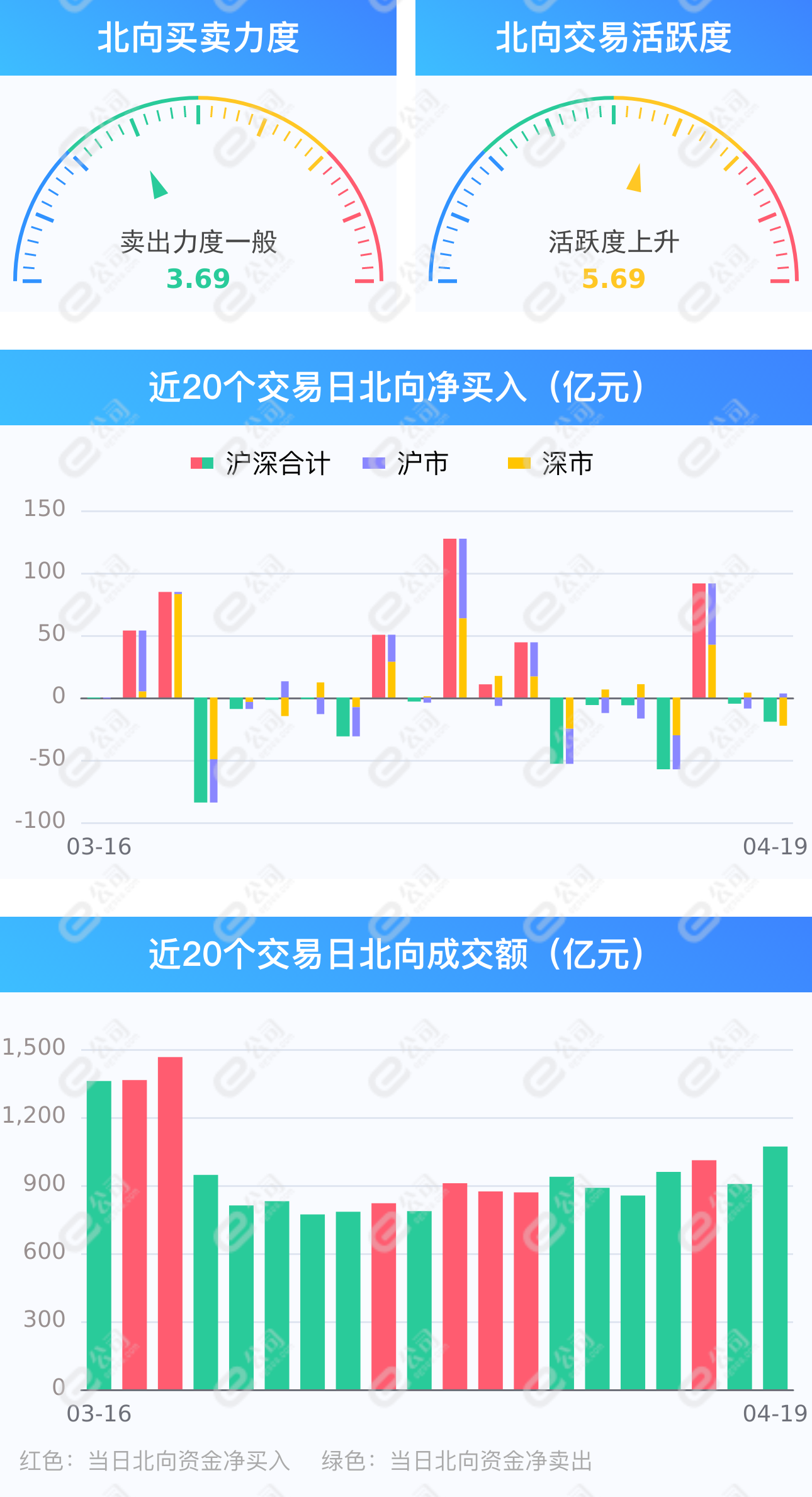 证券时报网讯,4月19日,截至A股收盘,统计数据显示北向资金合计净卖出19.43亿元,其中沪股通净卖出22.64亿元,深股通净买入3.21亿元。北向资金成交金额1070.44亿元,占A股总成交额13.83%,交易活跃度上升18.28%。