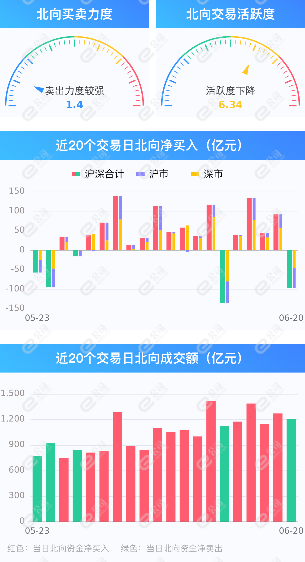 证券时报e公司讯,6月20日,截至A股收盘,统计数据显示北向资金合计净卖出97.03亿元,其中沪股通净卖出46.32亿元,深股通净卖出50.71亿元。北向资金成交金额1200.55亿元,占A股总成交额10.36%,交易活跃度下降5.44%,其中沪股通买入金额249.09亿元,卖出金额295.41亿元,深股通买入金额302.67亿元,卖出金额353.38亿元。北向资金中止连续4日净买入。